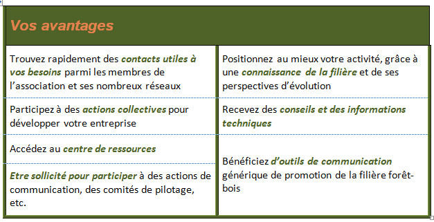 Etre le porte-parole de la filière en assurant la promotion des métiers, de la filière, du bois construction, du bois énergie et des entreprises |