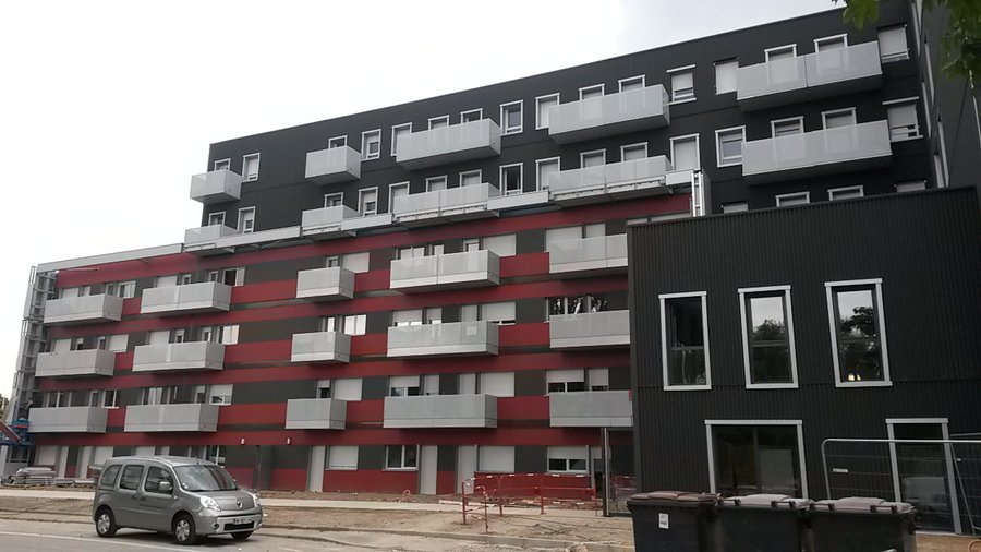Spécialiste de l’habitat modulaire en bois, Sorec Habitat vient de réaliser l’exploit de livrer en moins d’un an 200 logements étudiant au CROUS de Strasbourg. Le bâtiment R+5 a été élevé en empilant selon le procédé Dhomino des modules à ossature bois autoporteurs. Chaque module de 16 mètres de long, 4 mètres de largeur et 3,20 m de hauteur est composé de deux studios chacun équipé d’un balcon et séparés par une circulation centrale. Les modules ont été livrés finis et même meublés. Cette réalisation démontre les avantages de la construction industrialisée en ossature bois pour des immeubles de plusieurs étages.